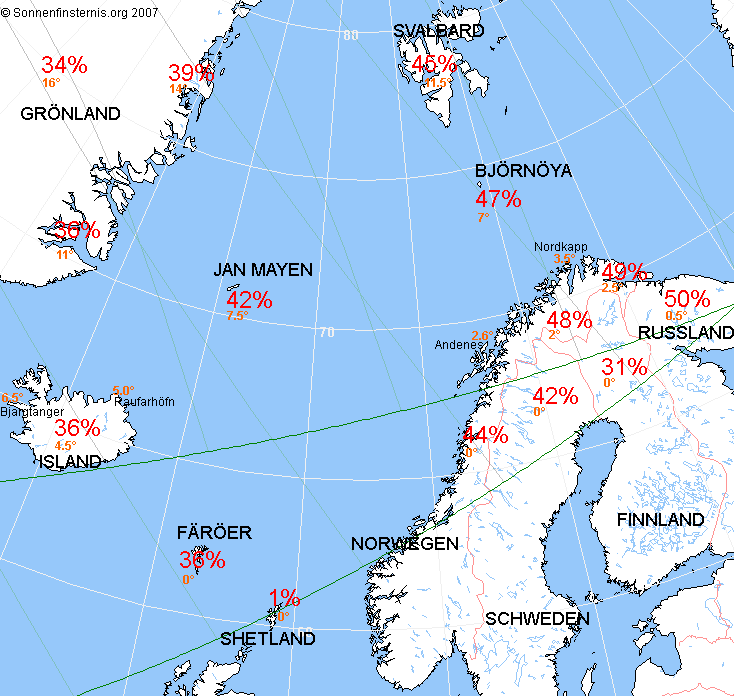 Links: Finsternismitte am Nordkapp; 48.5% der Sonnenscheibe bedeckt; Sonne 3.6° über dem Horizont.