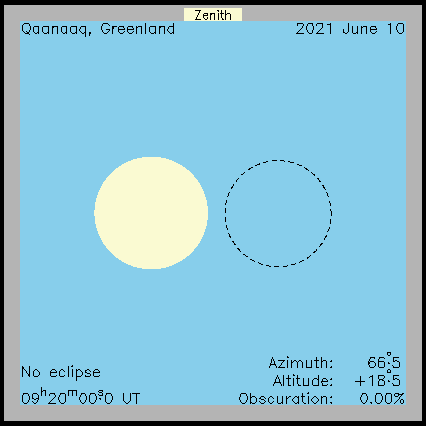 Himmelsanblick während der SoFi am 10.06.2021. Standort: Iqaluit (Kanada; 63°45'N / 68°36'W). Diagramm erstellt mit Stellarium.
