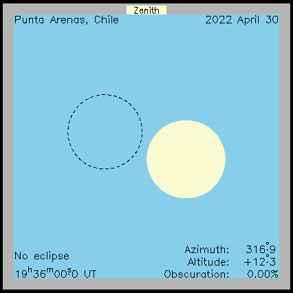 DIE SONNENFINSTERNIS AM 30.04.2022 IM ÜBERBLICKDie Sonnenfinsternis vom 30.04.2022 (Diagramm von Fred Espenak) spielt sich hauptsächlich über den endlosen Wasserflächen des südöstlichen Pazifiks ab (Karte). In Chile und Argentinien kann sie bei Sonnenuntergang beobachtet werden, wobei im Süden Patagoniens etwa die Hälfte der Sonne vom Mond abgedeckt wird, was gerade so zu einer wahrnehmbaren Abschwächung des Tageslichts reicht. Es handelt sich also um eine ziemlich durchschnittliche partielle SoFi.