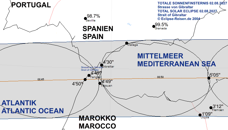 über dem Atlantik auf halbem Weg zwischen den Antillen und den Azoren. Auf seinem Weg nach Osten zieht der Kernschatten etwa rund 90 Kilometer nördlich an Madeira vorbei. Rund 10 Minuten später erreicht er beiderseits der Straße von Gibraltar das Festland. Auf der afrikanischen Seite verdunkelt sich die Sonne in Tanger für 4m49s, auf der europäischen Seite erlebt Gibraltar die Schwarze Sonne für 4m33s (Detailkarte). Die Zentralzone zieht sich nun entlang der Nordküste Afrikas, wobei u.a. die Touristenhochburg Djerba überquert wird (Finsternisdauer 4m37s). Die lybische Stadt Benghazi, die genau auf der Zentrallinie liegt, kommt für mehr als 6 Minuten in den Genuss der Schwarzen Sonne (Detailkarte).