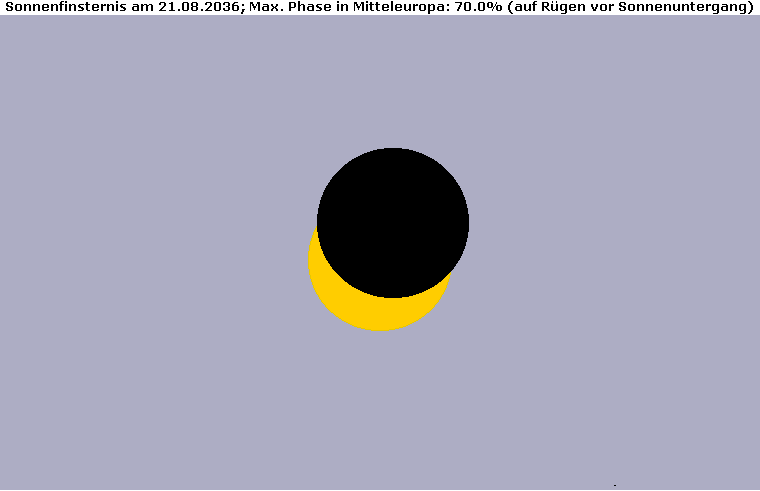DIE SONNENFINSTERNIS AM 21.08.2036 IM ÜBERBLICKDie partielle Sonnenfinsternis am 21.08.2036 ist in Alaska, Kanada, Grönland, in der Westhälfte Europas sowie im Nordwesten von Afrika zu sehen. Dabei werden im Maximum, das in der Barentssee knapp westlich von Novaya Zemlya erreicht wird, beachtliche 84% der Sonne vom Mond überdeckt. In der Gegend um das Nordkapp, wo sich um diese Zeit stets viele Sommerurlauber aufhalten, ist es nur unwesentlich weniger. Aber selbst im Nordosten Mitteleuropas verschwinden bei Sonnenuntergang (Karte) mehr als 2/3 unseres Tagesgestirns hinter dem Erdtrabanten. Abgesehen vom Osten Österreichs sind überall in Mitteleuropa Bedeckungsgrade von mehr als 50% zu verzeichnen.